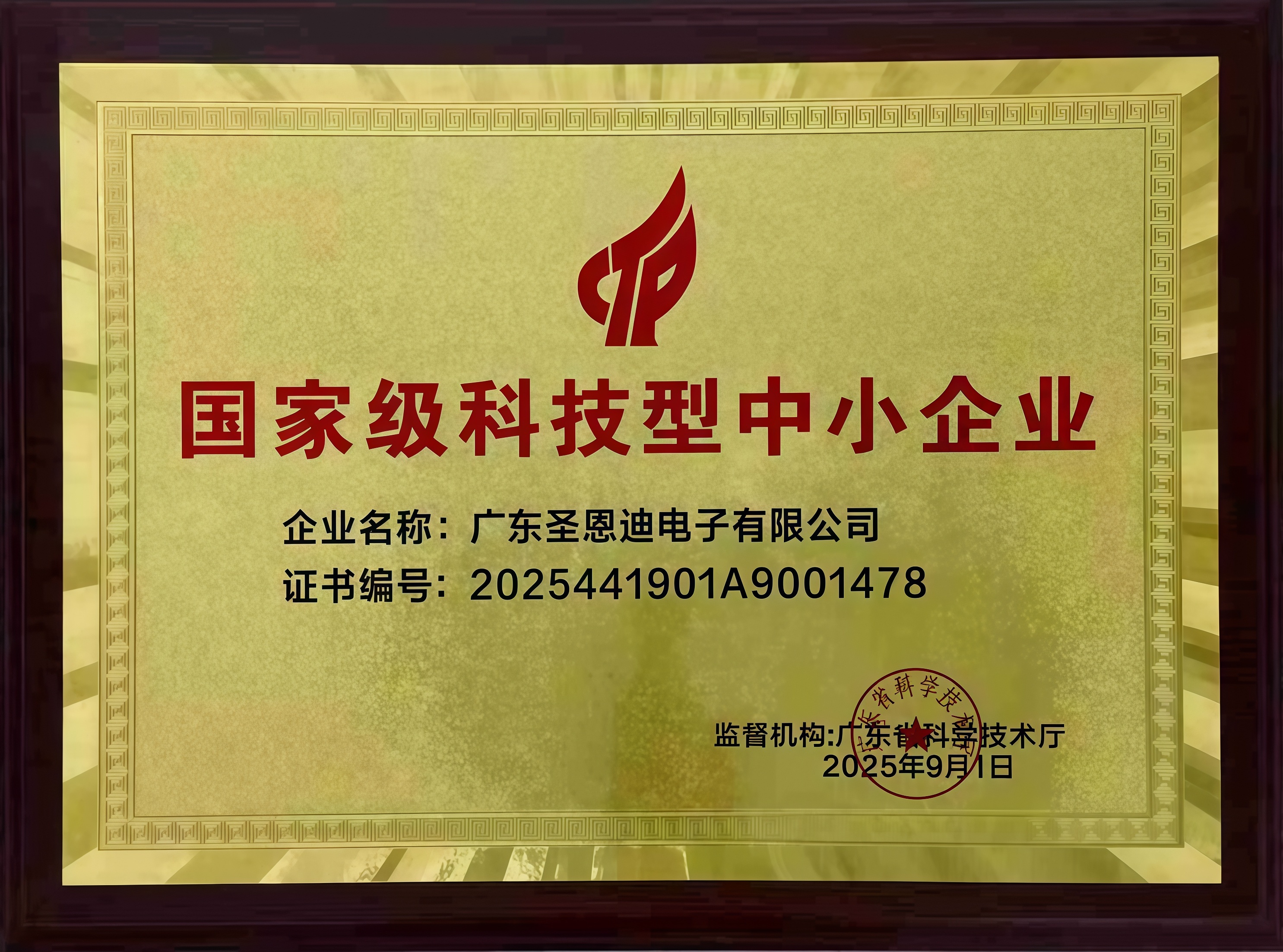 近日,广东圣恩迪电子有限公司接连斩获两项重磅荣誉:凭借在技术创新与研发实力上的卓越表现,公司成功入选“国家级科技型中小企业”名单,并继续保有由广东省工业和信息化厅认定的“创新型中小企业”称号,这标志着企业在高质量发展的道路上又迈出了坚实一步。