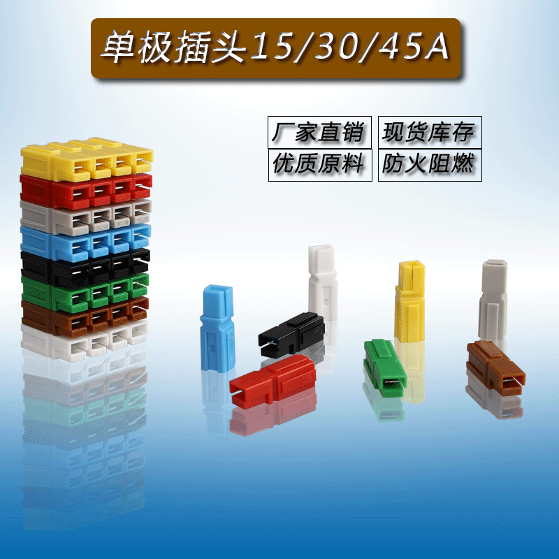 圣恩迪插头单极45a、不分公母、同颜色对插、有颜色:红色、蓝色、灰色、白色、褐色、绿色、黄色,黑色、可同颜色拼接成多极对插、可不同颜色拼接成多极对插、方便组合、